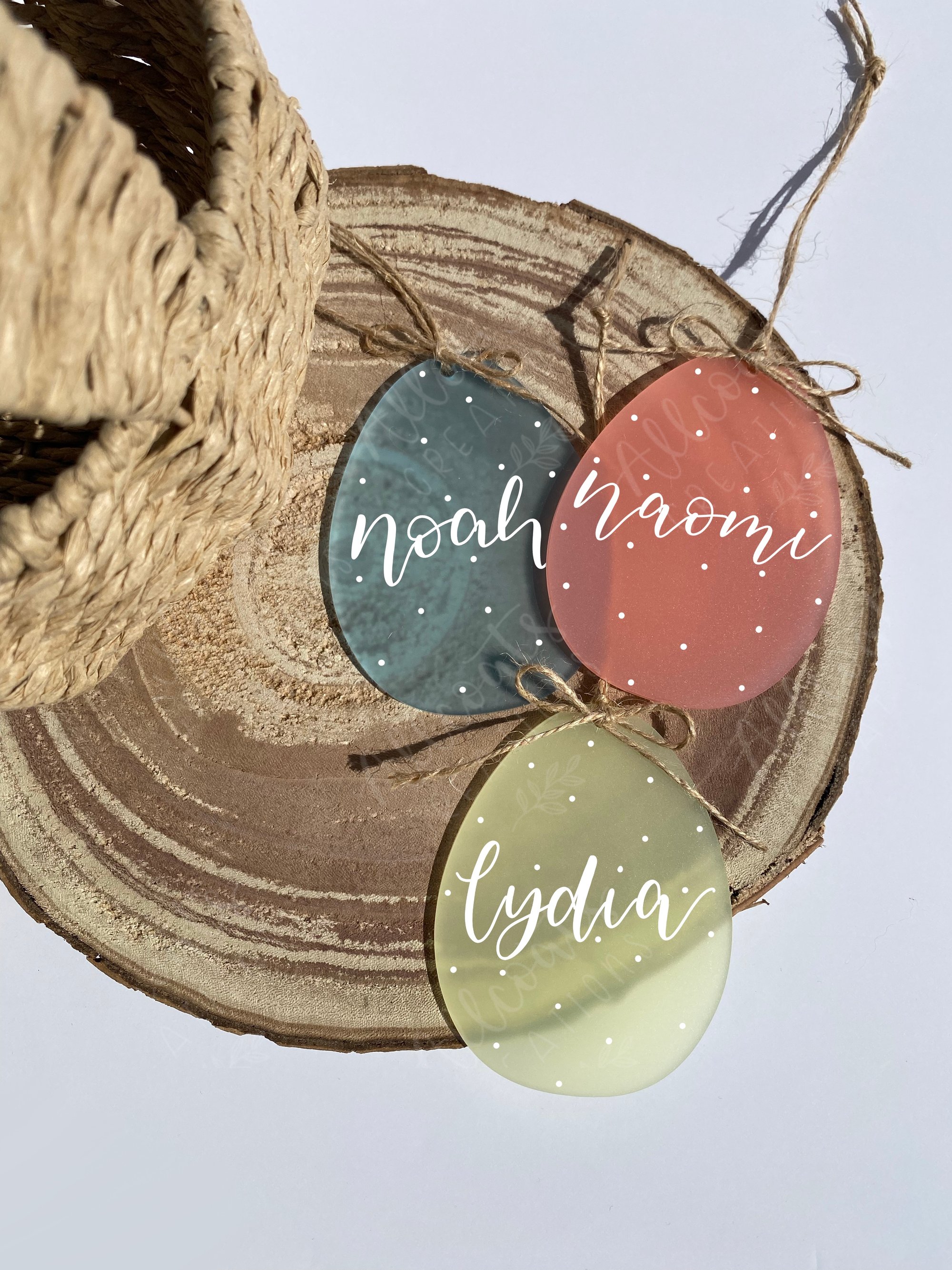 Each egg is made from frosted acrylic and finished with a delicate white dot detail, hand lettered with a name for a timeless, minimalist look.
