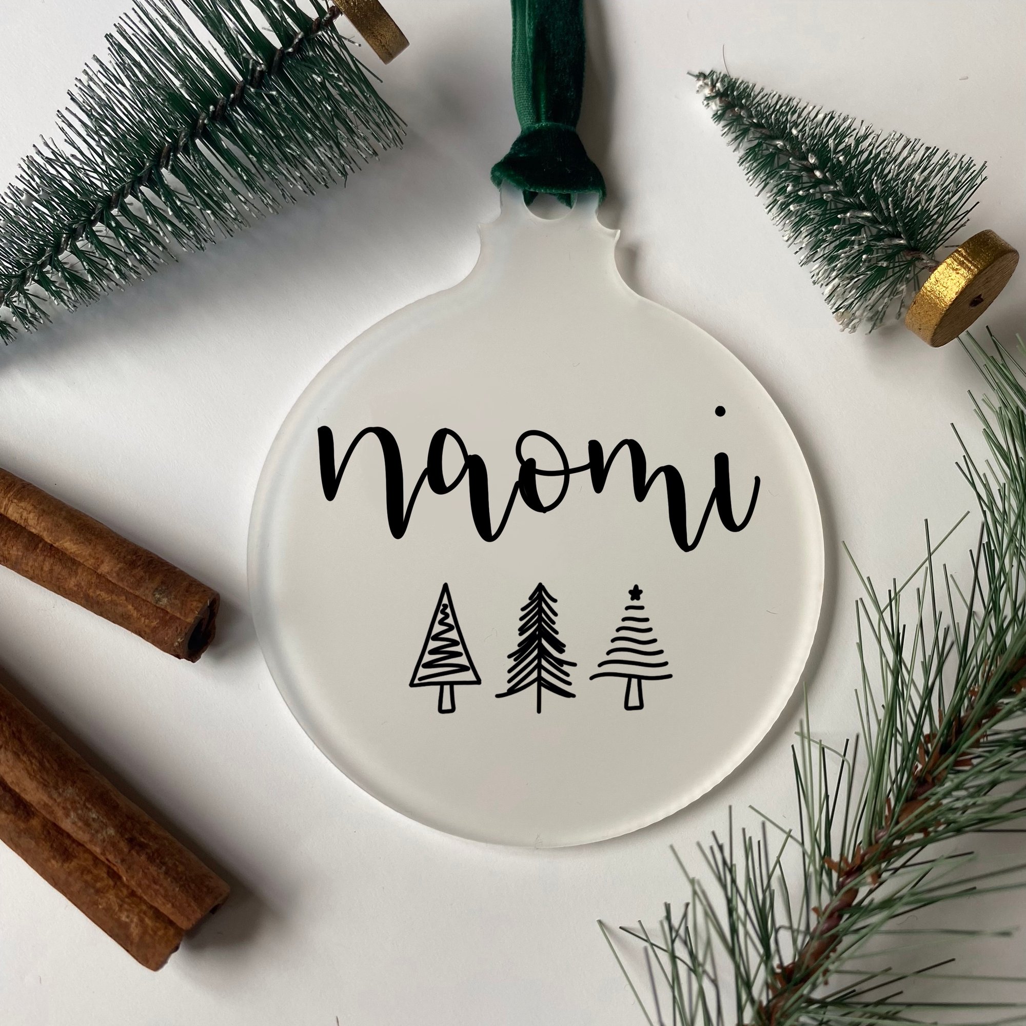 Add a classic woodland touch to your Christmas tree with this frosted acrylic bauble, hand lettered with your chosen name and featuring three hand-drawn trees.