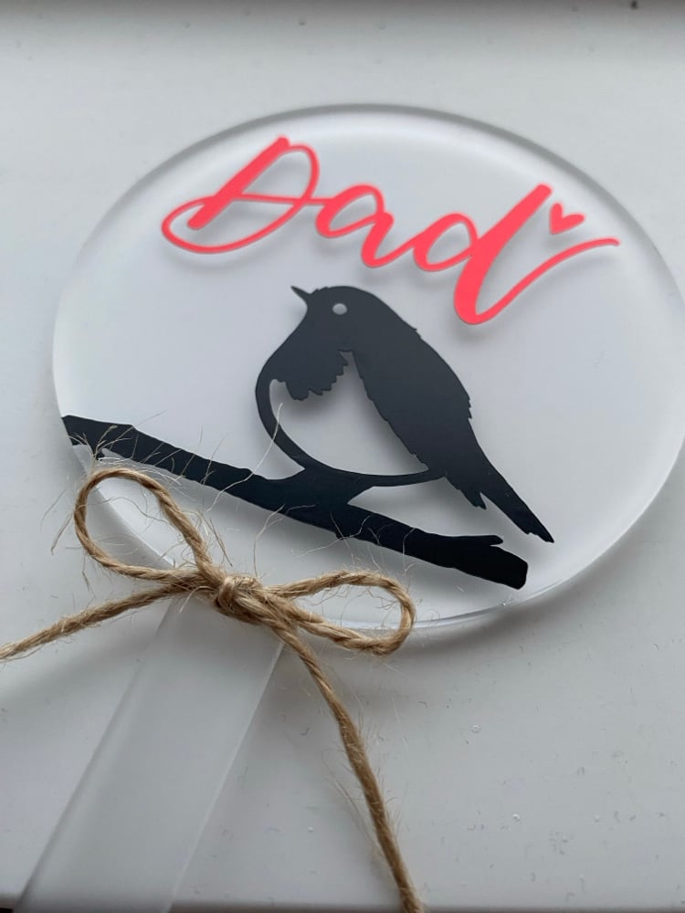 Our hand-lettered frosted acrylic grave marker comes in a circle paddle design, beautifully finished with a hand-drawn robin illustration – a traditional symbol of comfort and peace.